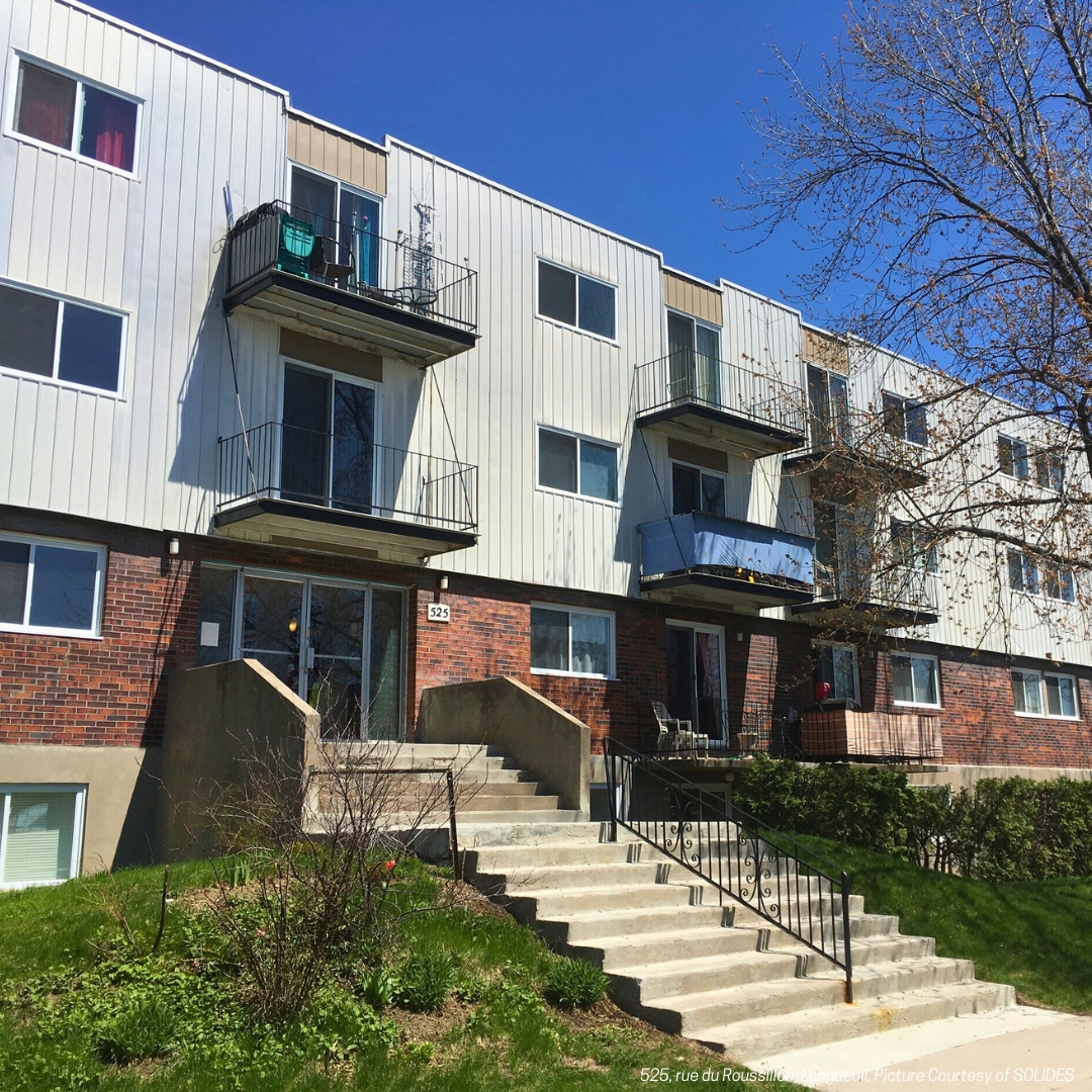 The acquisition of 520 rue d’Auvergne and 525 rue du Roussillon is the result of a multi-stakeholder collaboration between SOLIDES, First National Financial LP, NMF Rental Housing Fund II, CMHC MLI Select program, and federal funding.